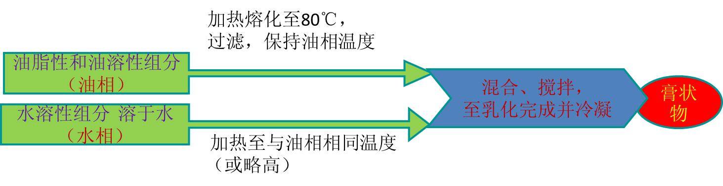 由油相、水相和乳化剂组成。常用的油相多数为固体,主要有硬脂酸、石蜡、蜂蜡、高级醇(如十八醇)等,有时为调节稠度加入液状石蜡、凡士林或植物油等。乳剂型基质有O/W型与W/O型两类。