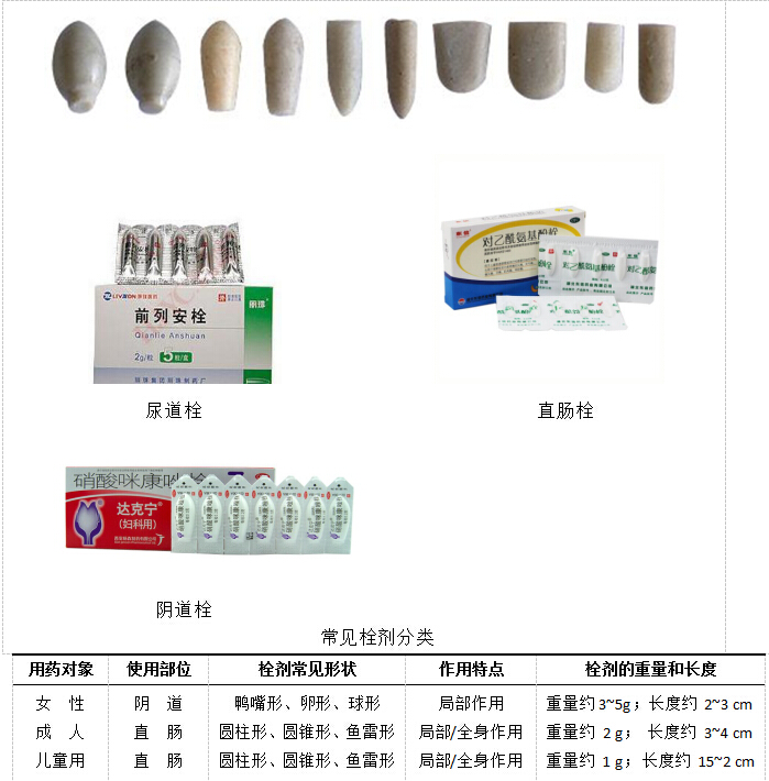 因腔道不同,分为直肠栓、阴道栓和尿道栓。直肠栓为鱼雷形、圆锥形或圆柱形等;阴道栓为鸭嘴形、球形或卵形等;尿道栓一般为棒形。