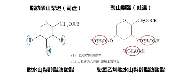 (2)脂肪酸山梨坦:商品名为司盘(spans),W/O。