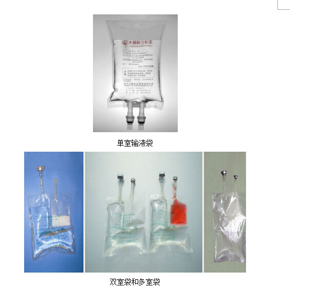 非PVC多层共挤膜输液袋不仅可制成50-10 000 ml不同规格的单室输液袋, 同时还可根据临床需要制成不同规格的双室袋或多室袋。如下图所示,多室袋主要是针对一些无法事前混合, 而临床上混合后输液更有利于药品吸收或有利于病人, 此时制成多室袋输液于用前混合再输液, 不仅解决了临床用药的难题, 而且也极大地方便了临床的使用。