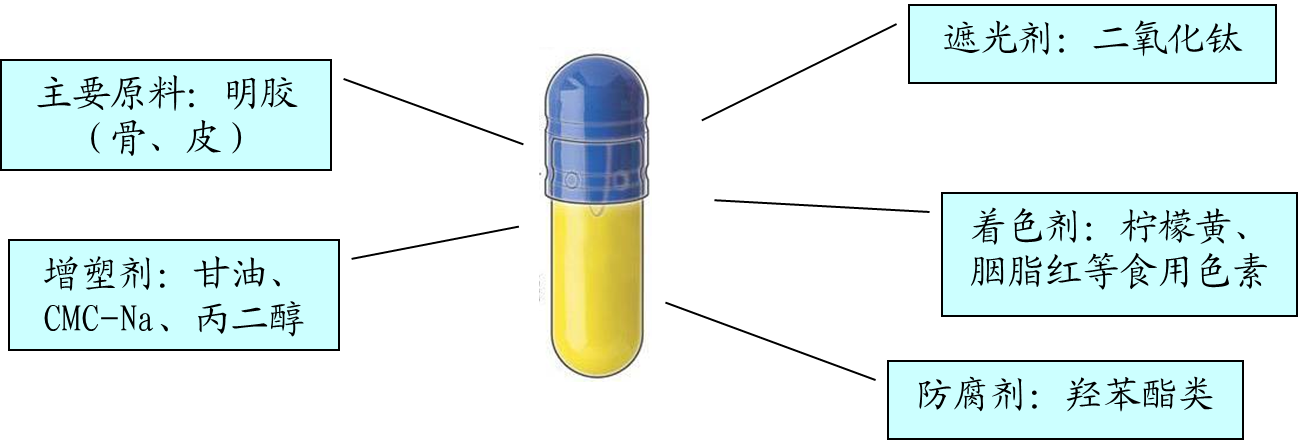 1.空胶囊 空胶囊的主要原料为明胶,由上下两节组成,分别称为囊帽和囊体。