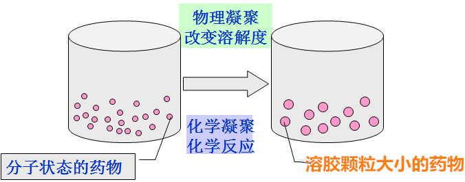 药物在真溶液中可因物理条件的改变或化学反应而形成沉淀,若条件控制适度,使溶液有一个适当的过饱和度,就可以使形成的质点大小恰好符合溶胶分散相质点的要求。