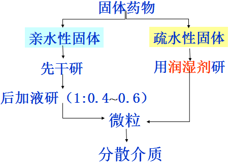 不润湿的药物不易均匀分散在分散媒中,微粒会漂浮或下沉。加入表面活性剂(润湿剂)可改变固体药物的润湿性,降低固-液间的界面张力,去除固体微粒表面的气膜,使制成的混悬剂稳定。