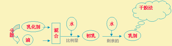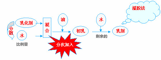 将水和油分次少量交替加入乳化剂中,边加边搅拌,形成乳胶。天然胶类、固体微粒作乳化剂时可用此法制备乳剂。