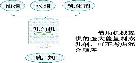 将油相、水相、乳化剂混合后用乳化机械制成乳剂。机械法制备乳剂时可不考虑加入顺序,借助机械提供的强大能量,能较容易制成乳剂。