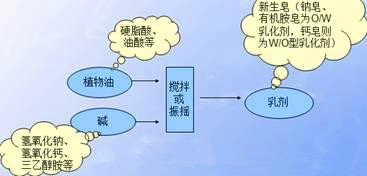 将植物油与含碱的水相混合搅拌会发生皂化反应,生成的肥皂可作为乳化剂来制备乳剂。植物油中含有硬脂酸、油酸等有机酸,加入氢氧化钠、氢氧化钙、三乙醇胺等,在70℃以上或振摇就会发生皂化反应。若水相中含有氢氧化钠或三乙醇胺,则生成的乳化剂是O/W型,若水相中含有氢氧化钙,则生成的乳化剂是W/O型。