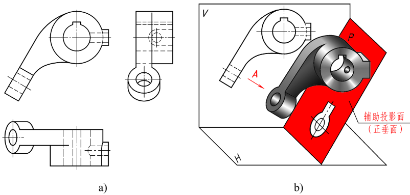 由于物体结构形状和复杂程度不同,仅采用主、俯、左三视图有时无法将它们的内、外形状准确、清晰、完整地表达出来,例如下图的压紧杆的三视图,俯视图和左视图均无法反映压紧杆倾斜部分的真实形状,不便于画图、读图和尺寸标注。为了更好地表达物体结构形状,需要引入其它更合理的表达方法。
