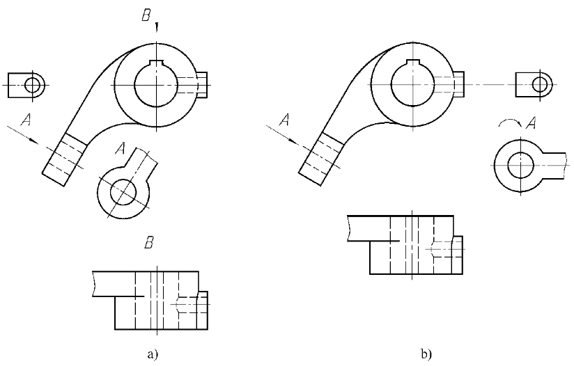 (2)斜视图的配置和标注一般按向视图相应的规定,必要时允许将斜视图旋转配置。此时应按向视图标注,且加注旋转符号。