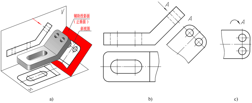 <四>、斜视图——将机件向不平行于基本投影面的平面投射所得的视图。