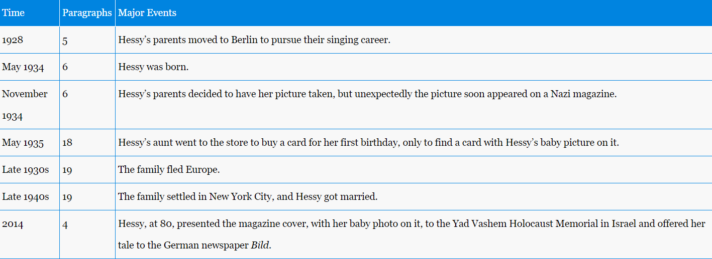 Hessy Levinsons Taft was born in Germany right afterHitler came to power. When she was six months old, her parents hadher picture taken. They put it on the piano as a private family photo.Nonetheless, to their horror, the picture soon appeared on the cover of a Nazi magazine.Being Jews/Jewish,they were afraid of publicity. So they contacted the photographer to find outwhat had happened. The photographer explained that he had sent in his 10 bestpictures for a competition/contest runby the Nazis, and that he had included Hessy’s picture in his submissions as ajoke. As it happened, Hessy was picked as the perfect Aryan baby.Within weeks, Hessy’s picture was seen everywhere. The whole story was theultimate irony forthe Nazi racist theory.