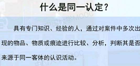 同一是指客体自身的同一,即他(它)只能是他()自己,而不是别的人或物。同一认定是科学的认识方法,是解决客体是否是同一为目的科学方法体系。刑事技术鉴定中的同一认定,是指鉴定人应用专门的知识及检验手段,解决嫌疑客体与侦查工作所要寻找的客体是否是同一客体为目的,进行检验和论证的科学理论和方法,即认定不同时间、地点出现过的客体是否为同一客体进行的鉴定。如根据不同时间、地点遗留的血迹和指纹认定为同一人的;根据不同时间、地点遗留的工具痕迹认定为同一工具的鉴定。由于事物运动与演变的绝对性,同一个客体在不同时间或空间出现时,尽管其e‘身仍是同一的,但也不是原来的他或它。所以,客体自身的同一并非完全等同,而是包含着差别的同一。