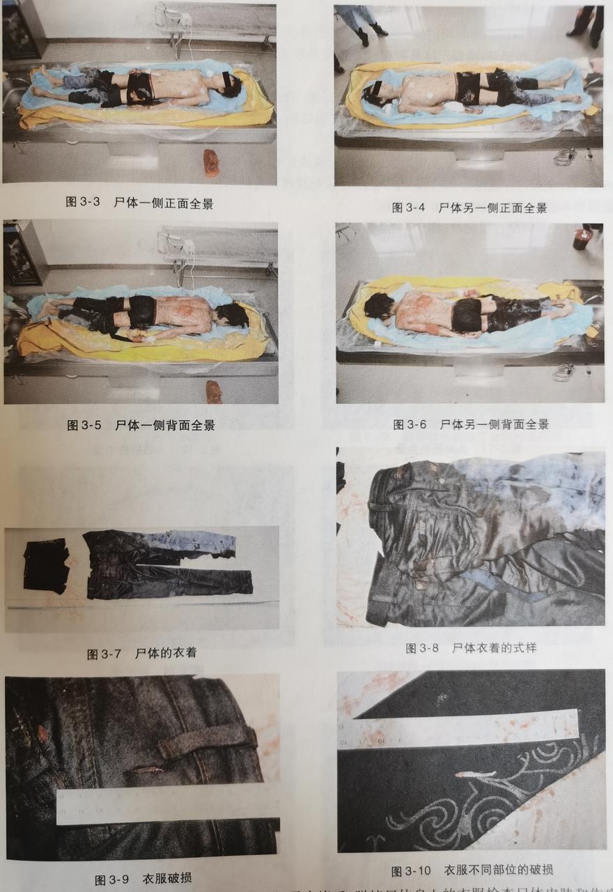 2,照相记录尸体的衣着和携带物品。照相时,应从外到里,从上到下,重点记录衣服的数量、式样、名称、新旧程度等。然后再对每件衣服进行详细检查记录,注意记录衣服有无撕破、纽扣有无丢失、拉链是否完好等特征,记录衣服上有无油垢、泥土等痕迹物证。还要检查每个口袋有无翻动,口袋里有无信件、证件、纸张和其他遗留物品,并照相记录。拍照实例见图3-7至图3-10