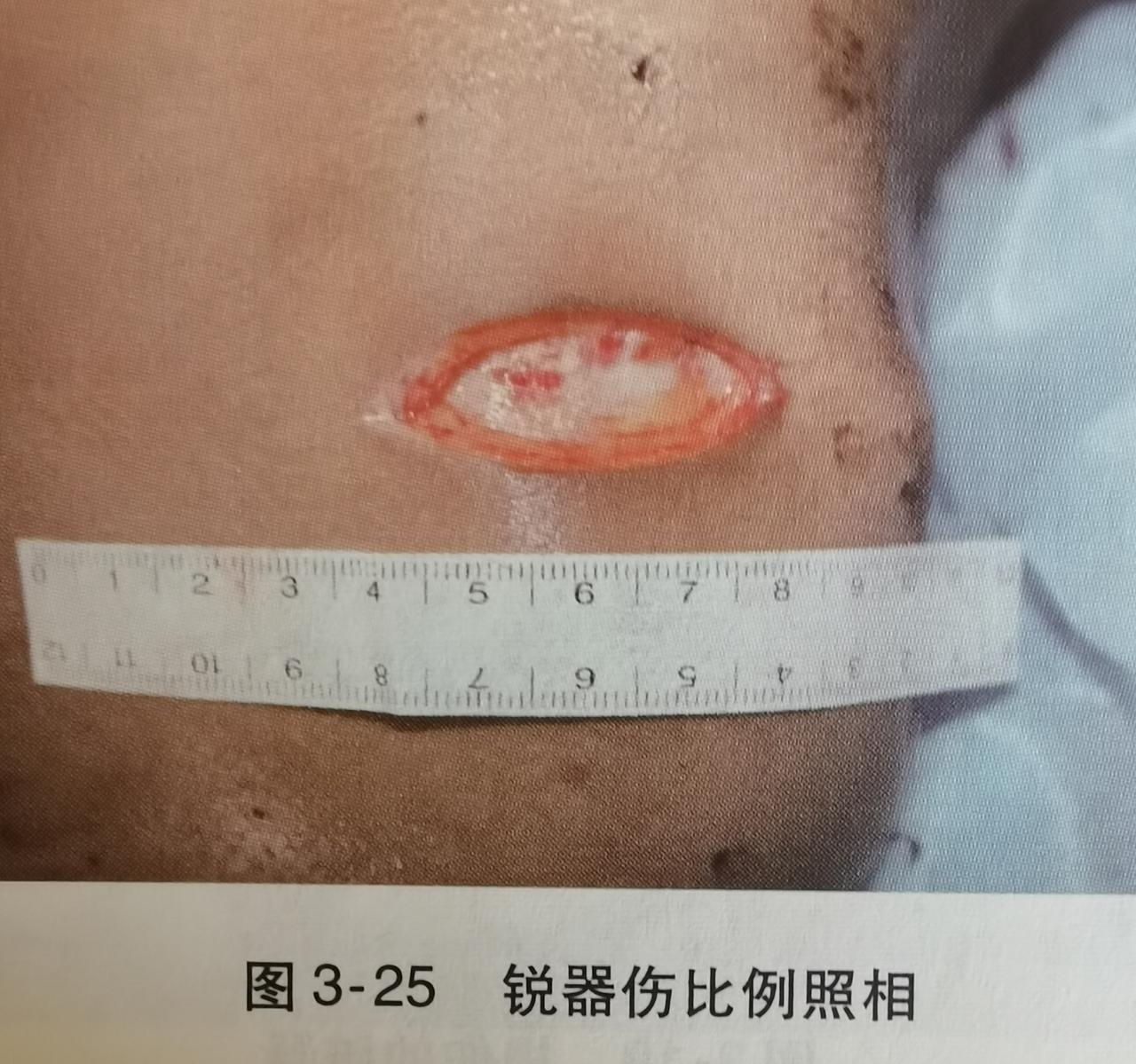 拍照要点:表现伤害的状况、数量、相对位置以及痕迹、附着物。要从尸体两侧(或一侧)方向,用相向法(或单向法)拍摄,拍摄角度约60。