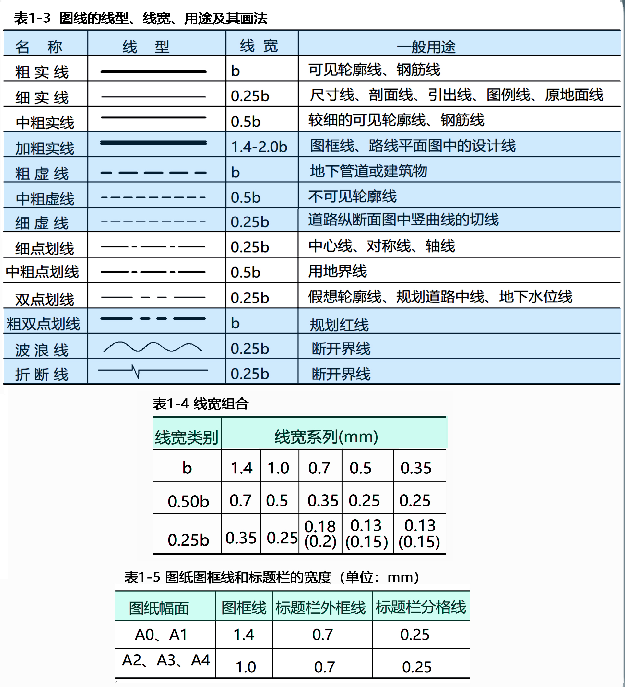 线宽:每种线型(除折断线、波浪线外)又有粗、中、细三种不同的线宽,如表1-3所示。线宽组可按表1-4选取。