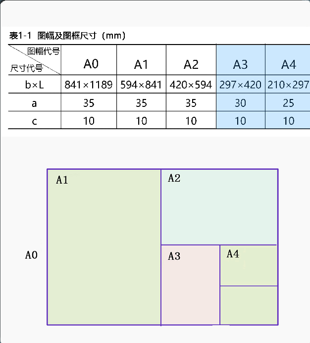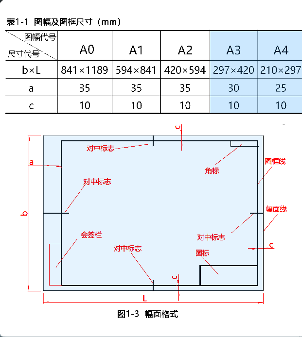 图幅是指绘图时采用的图纸幅面。为了合理使用图纸,所有图纸的幅面及图框尺寸应符合表1-1的规定。