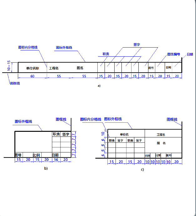 图框的右下角有一标题栏,标题栏是用来填写设计单位(设计人、绘图人、审批人)的签名和日期、工程名称、图名、图纸编号等内容的。图纸标题栏应按要求的格式分区绘制。