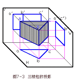 从三棱柱的投影图中可看到:其水平投影是一个三角形,它是三棱柱上、下底面的投影,三角形的三条边分别是左、右、后三个棱面的投影(有积聚性),三角形的三个顶点分别是三条棱线的水平投影;正面投影中两个并立的矩形是三棱柱左、右两个棱面的投影;正面投影的外形轮廓则是三棱柱后棱面的投影(反映实形);正面投影中上、下两条水平线是三棱柱上、下底面的投影(有积聚性);侧面投影只是一个矩形,左、右二棱面在此重影,上、下两条水平线仍是上、下底面有积聚性的投影,矩形的两条竖边中靠里面的一条还是三棱柱后棱面的投影(有积聚性)。