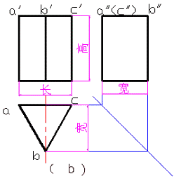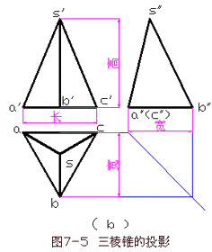 下图(a)所示为一位于三面投影体系中的正三棱锥SABC,锥底为水平面,后棱面为侧垂面,其它两个棱面则是一般位置平面。图(b)是该三棱锥的三面投影图。