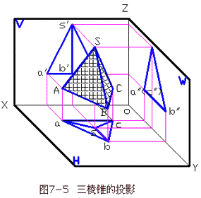 从三棱锥的三面投影图中可看到:其水平投影是由三个全等的三角形组成,它们分别是三个棱面的水平投影,形状为等边三角形的外形轮廓则是三棱锥底面的投影(反映实形);正面投影由两个三角形组成,它们是三棱锥左、右三棱面的投影,而外形轮廓的等腰三角形则是后棱面的投影,其底边为锥底的投影(有积聚性);侧面投影是一个三角形(左、右二棱面重影),靠里侧的斜边是侧垂位置的后棱面的投影,底边仍为锥底的投影。