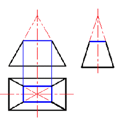 从四棱台的三面投影图中可看到:其水平投影是由两个相似的矩形形和四个梯形组成,它们分别是顶面和底面的实形及四个棱面的水平投影;正面投影一个梯形,它是棱台前、后棱面的投影,其顶边和底边为棱台顶面和底面的投影(有积聚性),左、右二棱线是左、右二棱面的投影(有积聚性);侧面投影也是梯形,它是棱台左、右二棱面的投影,其顶边和底边为棱台顶面和底面的投影(有积聚性),靠里侧的斜边是侧垂位置的后棱面的投影,靠外侧的斜边是侧垂位置的前棱面的投影。