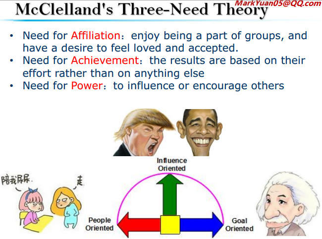 (大卫·麦克利兰(David McClelland)"三需求”理论):人的需求分为了三类:对亲和/归属需求(Need for Affiliation); 对成就需求(Need for Achievement); 对权力需求(Need for Power)