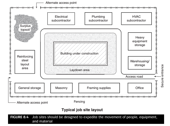 Before the contractor sets up the job site(施工现场), he or she should plan it on paper. A version of the site, with dimensions, access road, utility locations, elevations, and existing structures, should be noted. The layout should be drawn with an eye to how material will arrive and be processed and how people will move into and around the site. For instance, the main office trailer(活动板房) should be located close to the site entrance. ——why ? Visitors can be easily disoriented(迷失方向), which may contribute to safety problems. By locating the office near the entrance with clear signage(标示), visitors can sign in and be escorted (护送)to wherever they need to go. This location will also provide a security point for unauthorized visits(不速之客. )