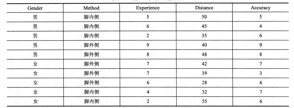 22.一位足球教练想评价一场足球比赛中两种不同踢法(脚内侧和脚外侧)的效果,5个男孩和5个女孩,使用其中一种方法踢球,记录了他们踢球的距离(英尺)和准确度(范围为1-10),也测量了小孩的经验水平(值越高表明经验越多)。下表给出了数据。(10分)