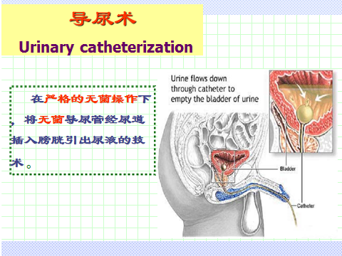 -协助临床诊断:如留取未受污染的尿标本作细菌培养;测量膀胱容量、压力及检查残余尿;进行尿道或膀胱造影等。