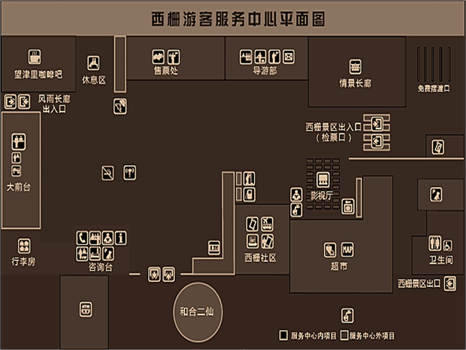 导游服务区、咨询与投诉区、商品展示与销售区、储物区、特殊人群服务区(如提供拐杖、轮椅、育婴服务)、休息区、安保区、医务室、景区活动项目提示区等