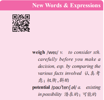 1. ... you'll want to weigh the advantages and potential problems before jumping into the dating scene. ……在谈恋爱之前,你可能需要衡量一下这些好处与恋爱可能带来的问题。此句意为:... you'd better consider carefully the advantages and possible disadvantages of college dating before dating someone.