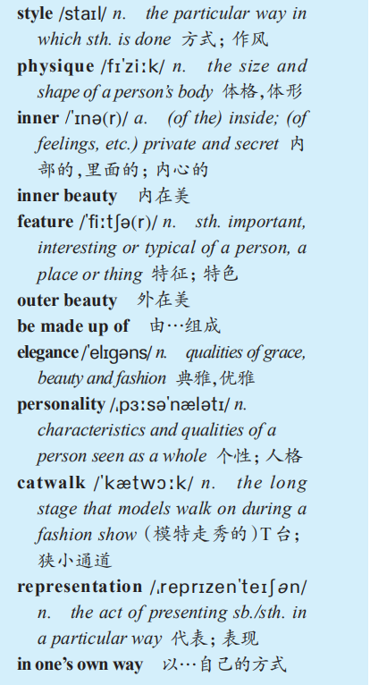 4. inner beauty: The internal beauty of a person. It depends on the way how a person does things, how they move, the way they speak to others and the way they dress themselves. Inner beauty includes psychological factors such as personality, intelligence, grace, politeness, charisma(感召力), integrity(诚实), congruence(和谐)and elegance. It involves such qualities as simplicity, cheerfulness, wisdom, tolerance, self-confidence, discipline, constancy(不屈不挠), courage, obedience(服从), patience, sincerity(真诚)and hard work.