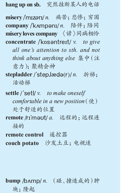 2.couch potato: a person who spends a lot of time sitting or lyingdown, often watching television, eating snacks or drinking alcohol沙发土豆,指的是那些拿着遥控器,什么事都不干,只会蜷在沙发上看电视的人。这个词最早诞生于美国,形象地描述了电视对人们生活方式的影响:一个人长时间坐在沙发上,就如土豆一样一动不动。长此以往,人就会像土豆一样胖胖圆圆的,久而久之,可能患上胆结石,甚至心理孤独等疾病,是一种不健康的生活方式。