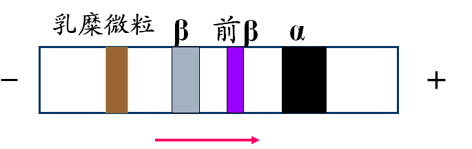 按其移动的快慢,可将脂蛋白依次分为:α-脂蛋白、 前β-脂蛋白、β-脂蛋白,乳糜微粒在原点不动。