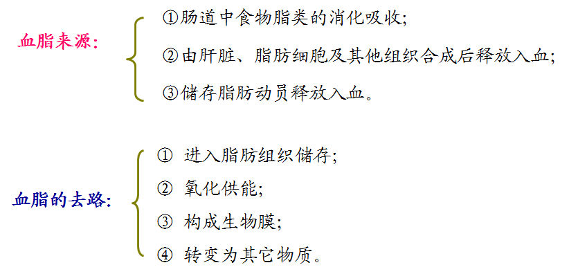 3.血脂:血浆中所含脂类的总称,主要包括甘油三酯、磷脂、胆固醇、胆固醇酯及游离脂肪酸等。血脂与血浆中的蛋白质结合形成水溶性复合物--LP形式存在和运输。