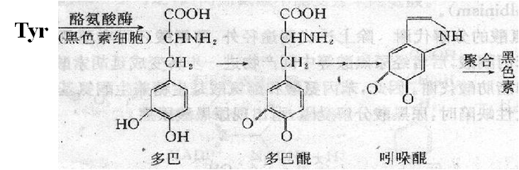 4.酪氨酸的另一条代谢途径是在黑色素细胞中经羟化、氧化、脱羧等反应生成吲哚-5,6-醌,再聚合成黑色素。