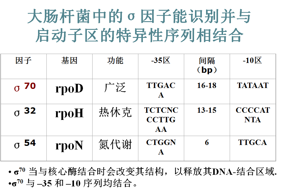 在某些细菌中含有识别不同启动子的σ因子,以适应不同生长发育阶段的要求,控制不同基因转录的起始。