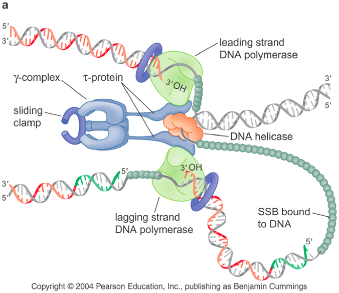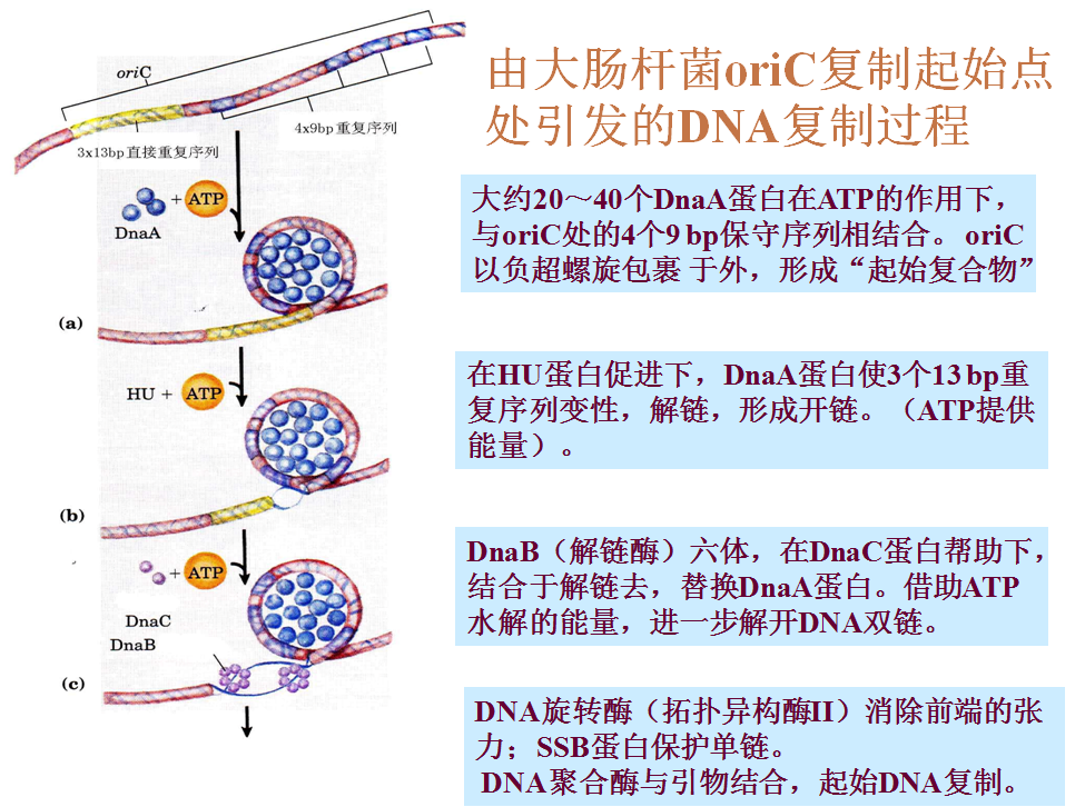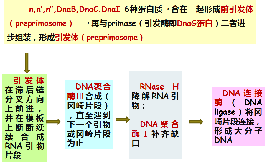 引发酶(DnaG蛋白)在起点处合成一段RNA引物(10~60nt)—→DNA聚合酶Ⅲ在引物3‘端上加入脱氢核糖核酸,合成leading strand—→前导链的合成与复制叉的移动保持同步。
