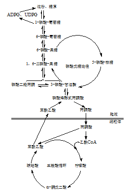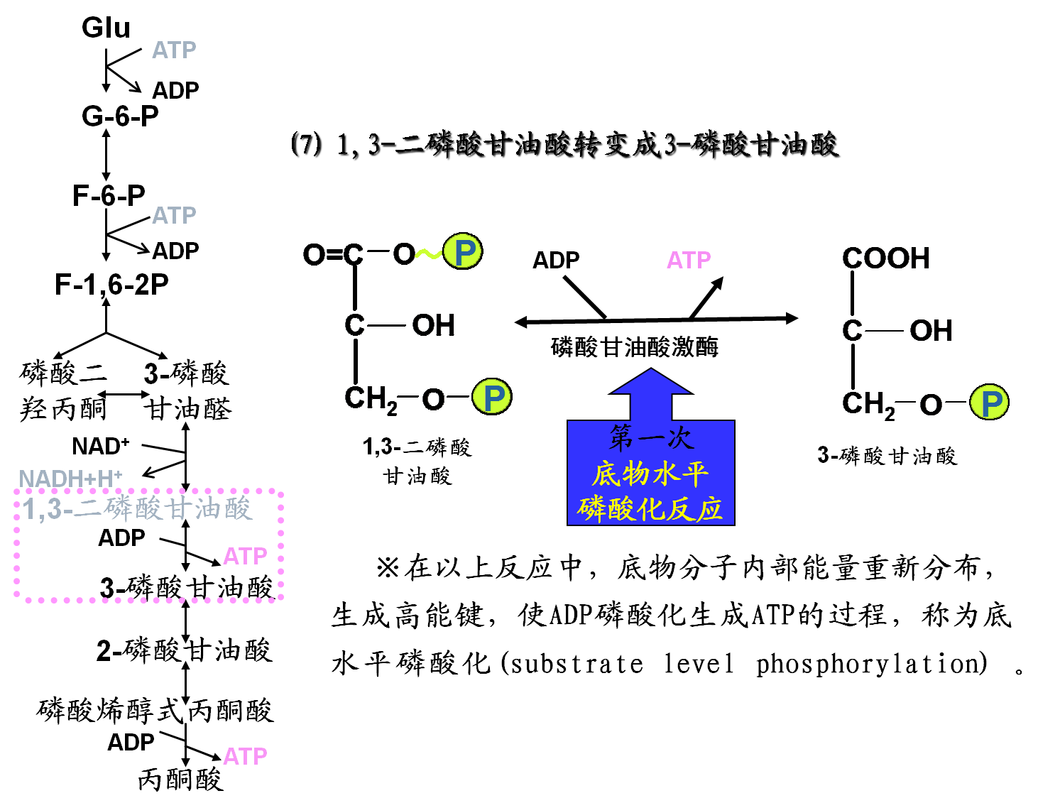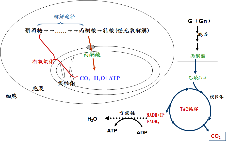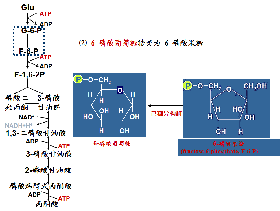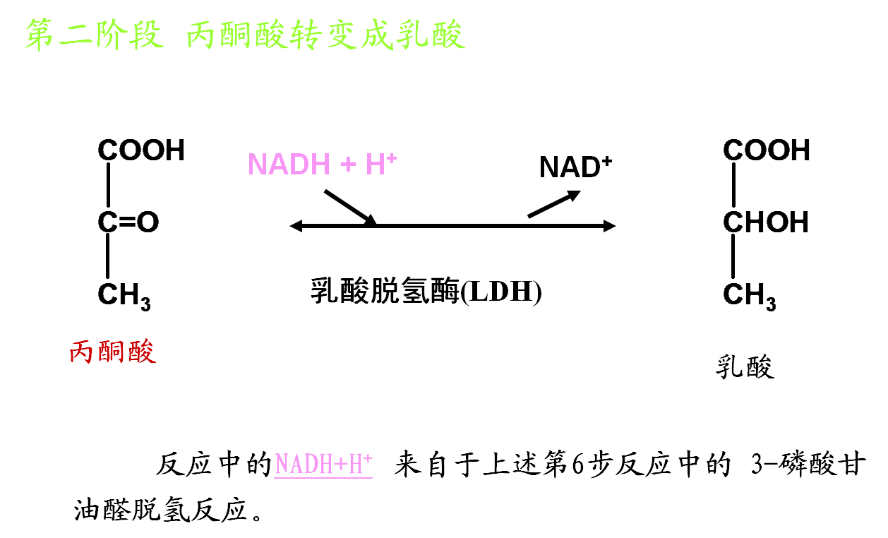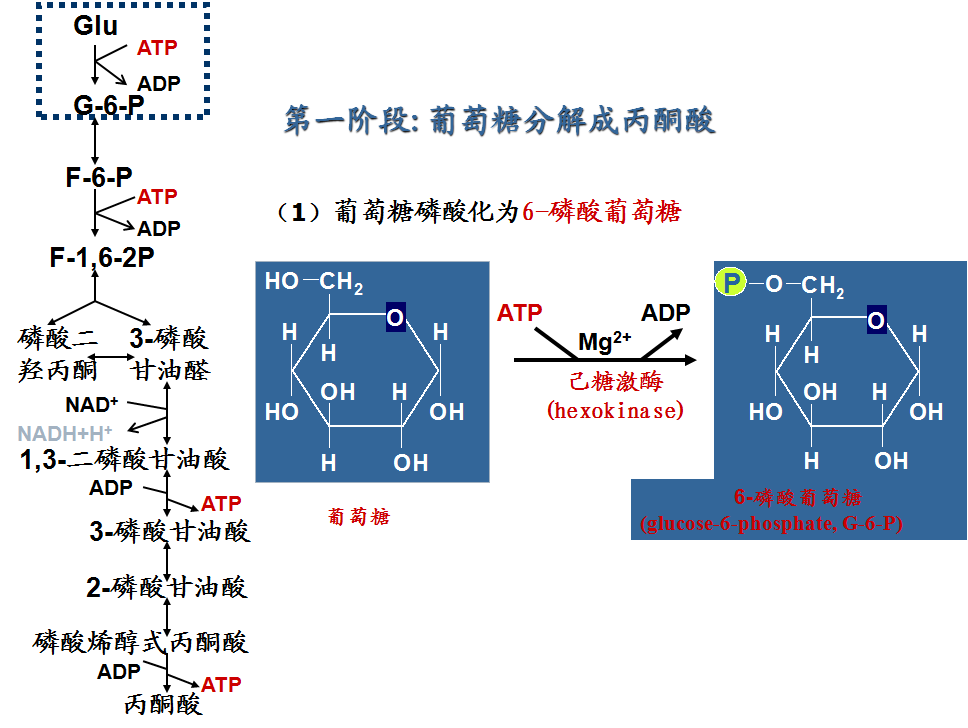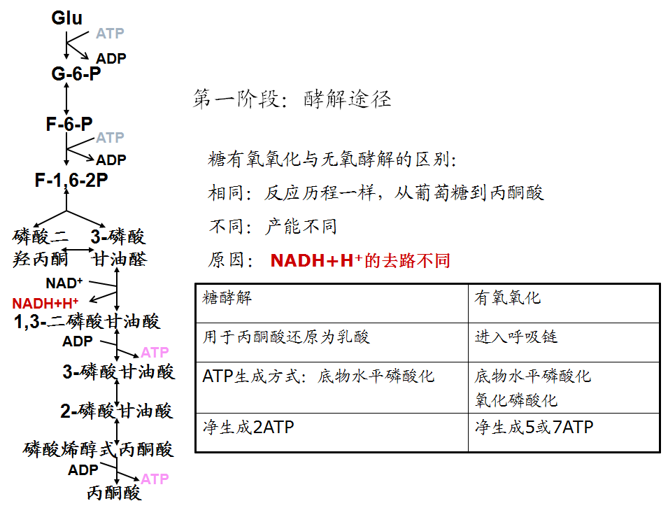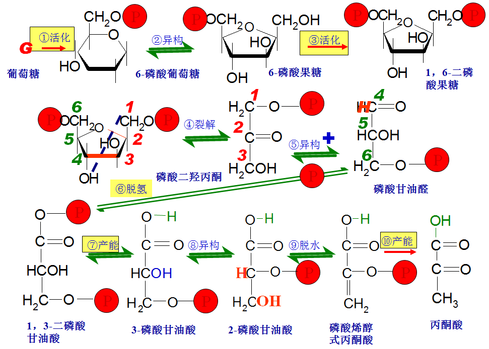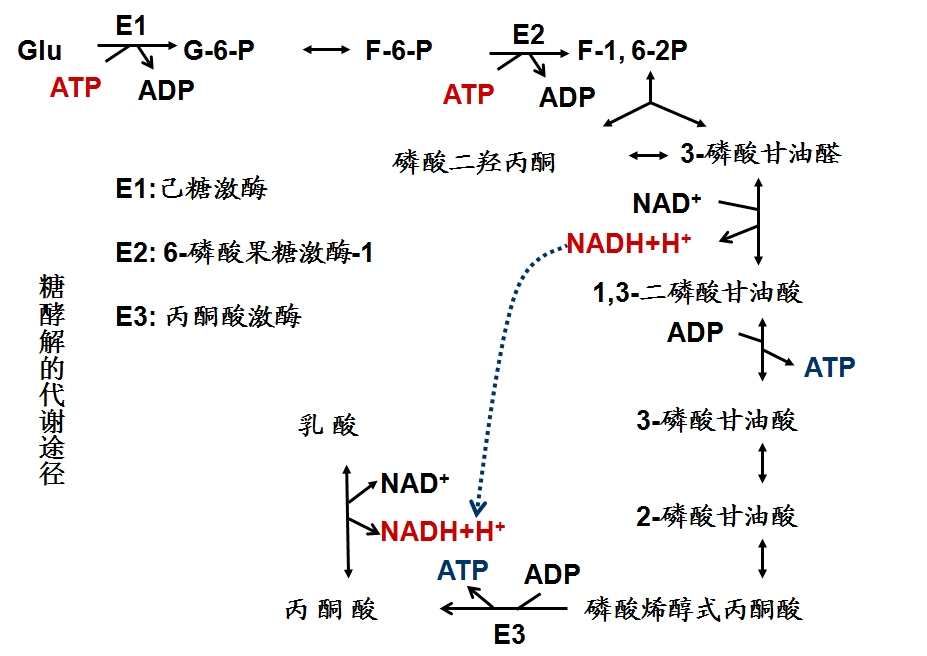① 由葡萄糖分解成丙酮酸(pyruvate),称之为糖酵解途径(glycolytic pathway)。