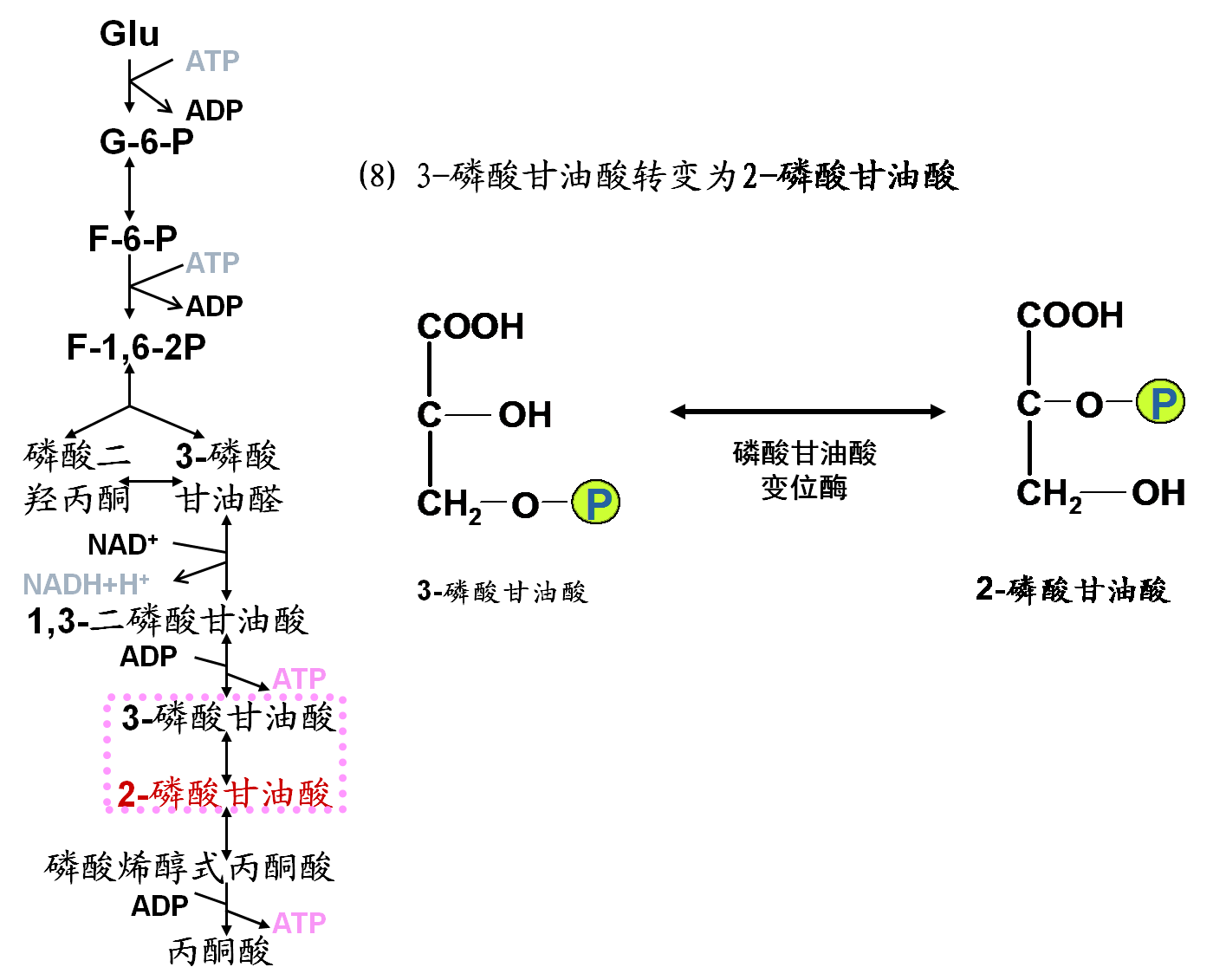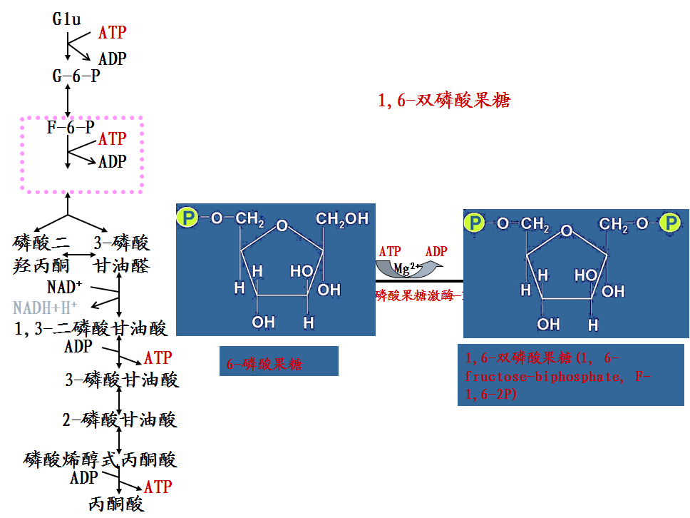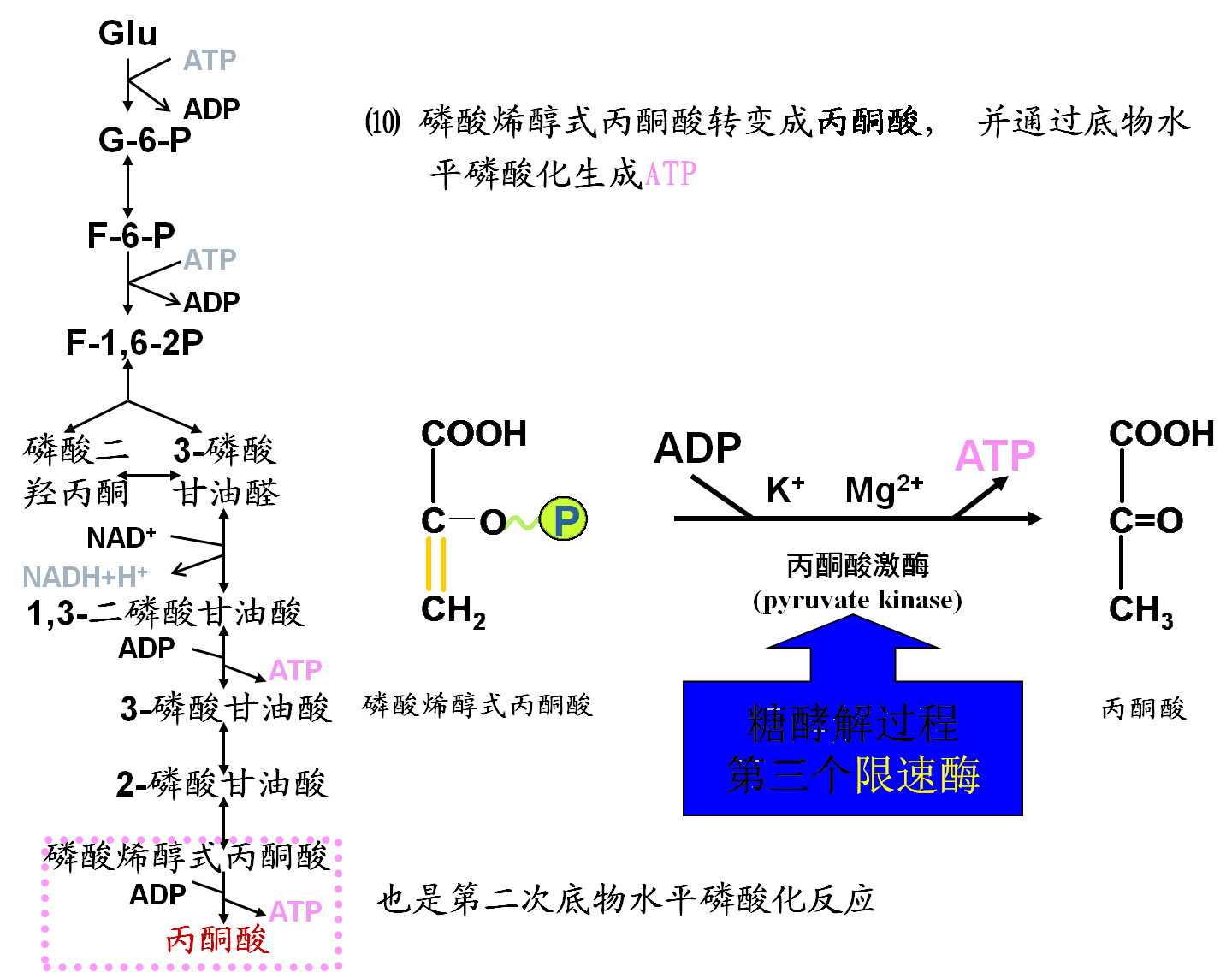 (3)糖酵解中有三步反应不可逆,分别由己糖激酶、磷酸果糖激酶、丙酮酸激酶催化,因此这三种酶对酵解速度起调节作用。