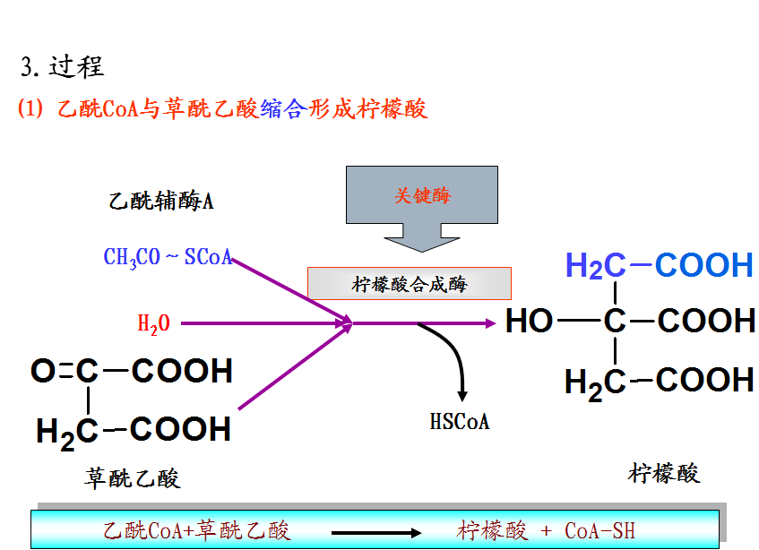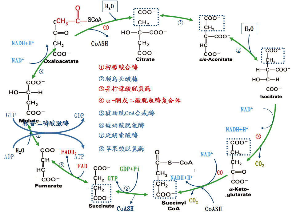 ③ 三羧酸循环一周包括三步不可逆反应,分别由柠檬酸合成酶、异柠檬酸脱氢酶和α-酮戊二酸脱氢酶系催化,使整个循环不可逆。