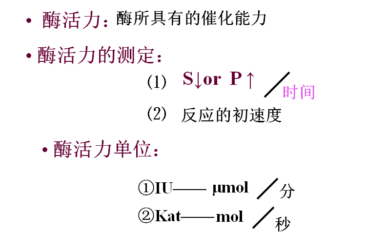 2. 酶反应速度:用单位时间内、单位体积中底物的减少量或产物的增加量来表示。单位:浓度/单位时间