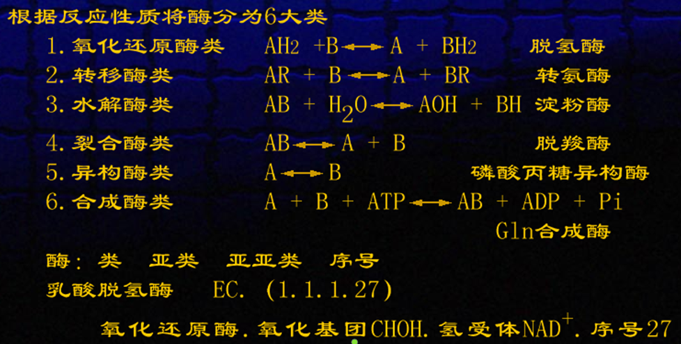 根据 作用底物(S):淀粉酶 蛋白酶 反应性质 :脱氢酶 转氨酶