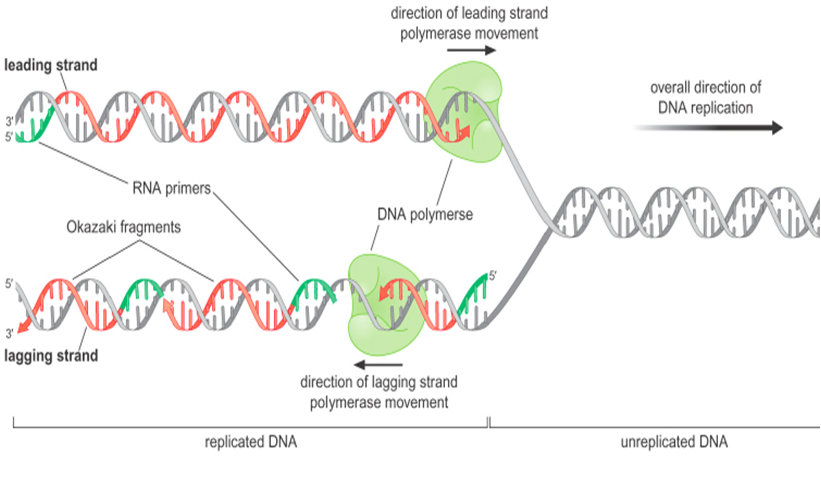 在DNA复制时,亲代DNA碱基间氢键断裂使双螺旋解旋和分开,然后,以每条单链为模板(templet),按照碱基互补配对的原则,在这两条链上各合成与之互补的一条新链,这样从亲代DNA分子可精确复制成与原来DNA分子碱基序列完全一样的两个子代DNA分子。子代DNA分子中的一条链从亲代DNA来,另一条链则是新合成的。