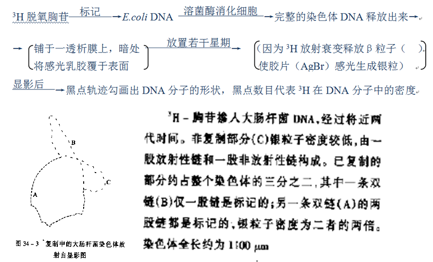 1963年Cairns用autoradiograph(放射自显影的方法)首次观察到完整的正在复制的E.coli chromosome DNA