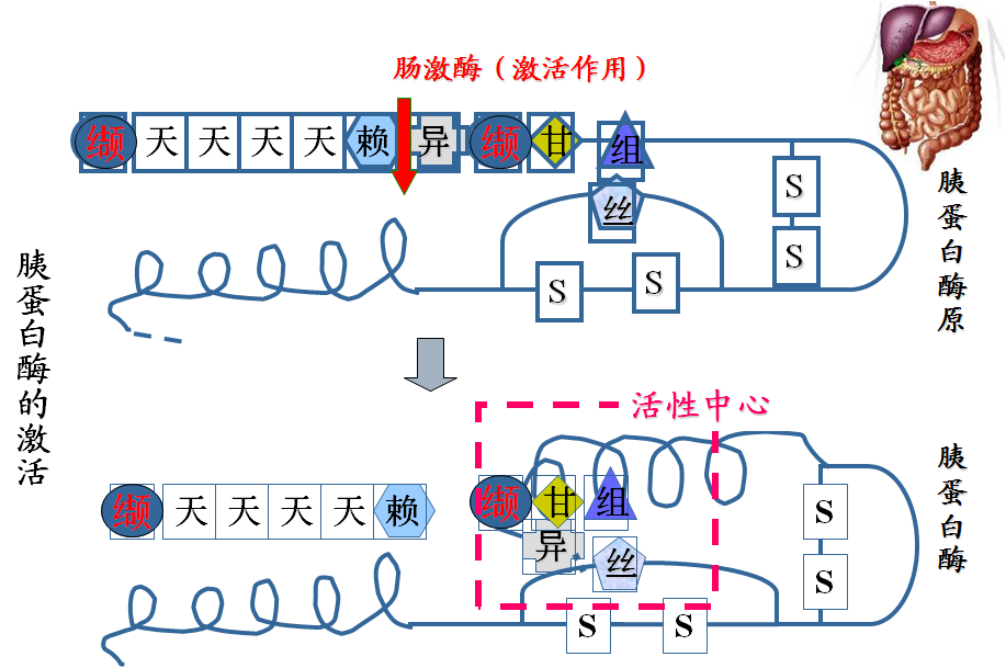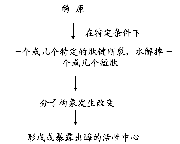 酶原的激活——酶原必须在一定的条件下去掉一个或几个特殊的肽键,从而使酶的构象发生一定的变化,才有活性,这一过程称为酶原激活。