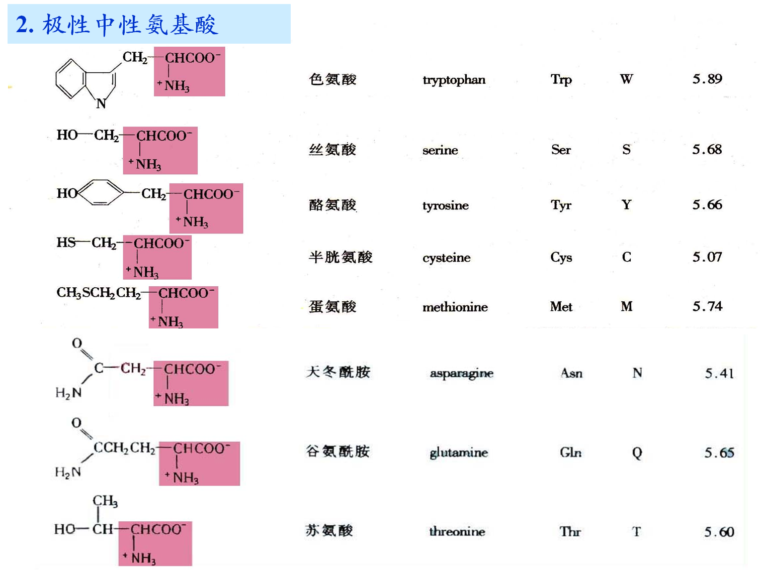 旋光性:除甘氨酸外,氨基酸都具有旋光性,能使偏振光平面向左或向右旋转,左旋者通常用(-)表示,右旋者用(+)表示。
