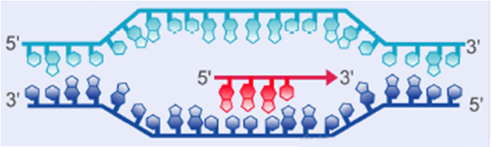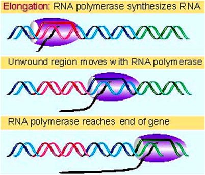 随着RNA聚合酶的移动,DNA双螺旋持续解开,暴露出新的单链DNA模板, 新生RNA链的3’末端不断延伸,在解链区形成RNA-DNA杂合物。