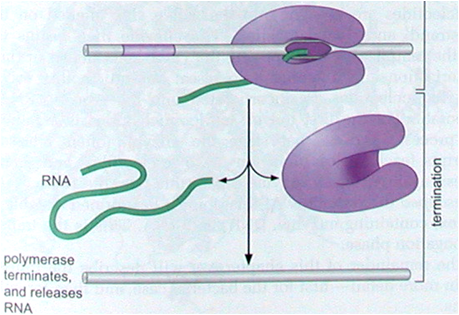 合成的终止: 当RNA链延伸到转录终止位点时,RNA polymerase 和RNA链均从DNA模板上释放出来。