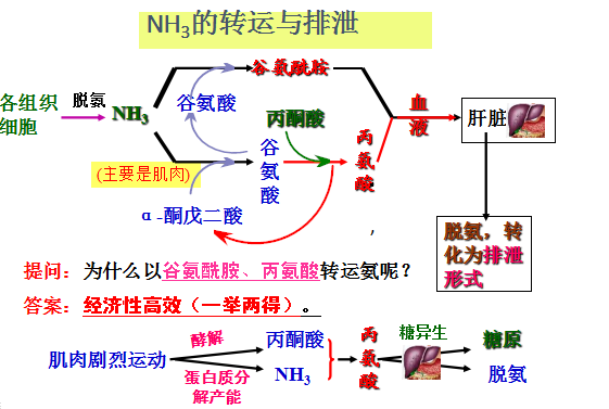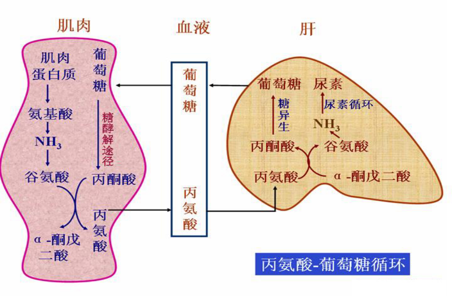 ■ 意义:既使肌肉中的氨以无毒的Ala形式运到肝,肝又为肌肉提供糖异生后的葡萄糖,避免了氨中毒和酸中毒。