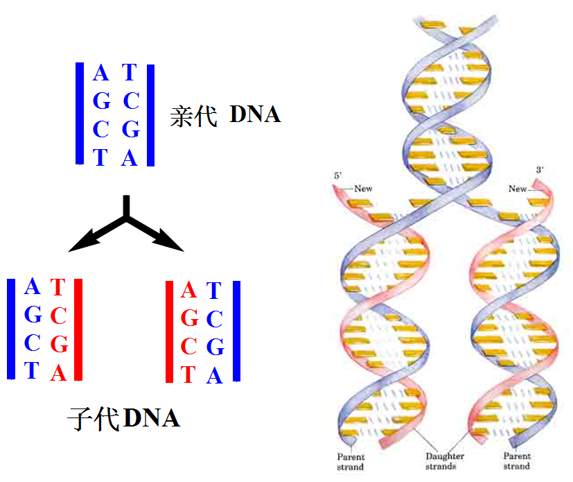 DNA复制时以亲代DNA两条链为模板指导合成与其互补的DNA链,这样在子代DNA中,一条链来于亲代DNA,另一条链是新合成的。DNA 的这种复制方式称为半保留复制。